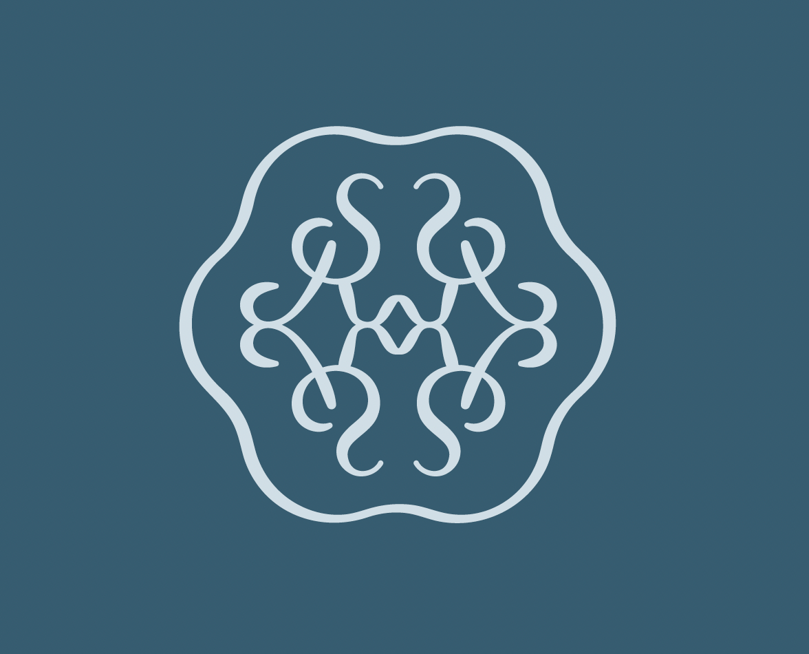 Die symmetrische Bildmarke ist wie ein Ornament gestaltet. Sie besteht aus verschlungenen Linien und Kurven, die an florale oder kalligrafische Muster erinnert.